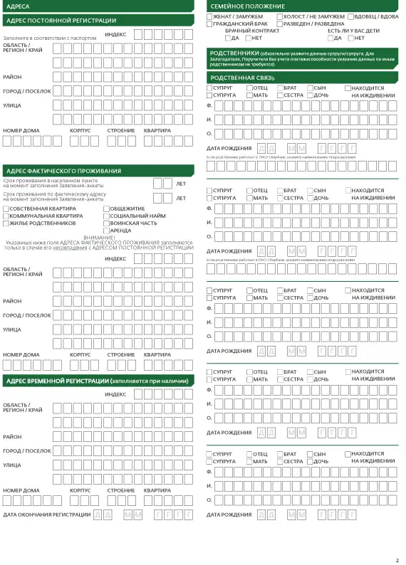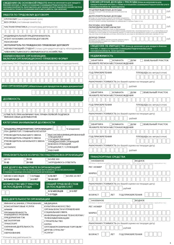 На второй странице анкеты-заявления на ипотеку в Сбербанк заемщик вносит следующие данные:
