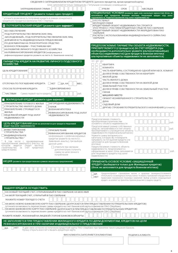 Шестая страница отражает информацию о желаемом кредитном продукте: